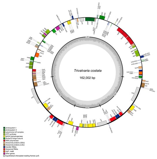 Fresh leaves of T. costata were collected from the South China Botanical Garden, Chinese Academy of Sciences (E 113°36′, N 23°18′). The E.Z.N.A.® Plant DNA Kit (OMEGA, Shanghai) was used to extract total DNA, and the Illumina NovaSeq6000 platform was utilized for carrying out pair-end sequencing with a 150 bp reading length. For raw data, quality control and evaluation were conducted using Cutadapt v1.16 [24] and FastQC v0.11.4 [25] software, respectively. The sequences were spliced using NOVOPlasty V4.2 software [26] followed by GetOrganelle V1.7.0 + [27] for optimal assembly results. The assembled cp genome was annotated using PGA [28] and Geseq (https://chlorobox.mpimp-golm.mpg.de/geseq.html, (accessed on 5 December 2022)) [29] software. The complete cp genomes were deposited in the NCBI GenBank under the accession number OM914484.
