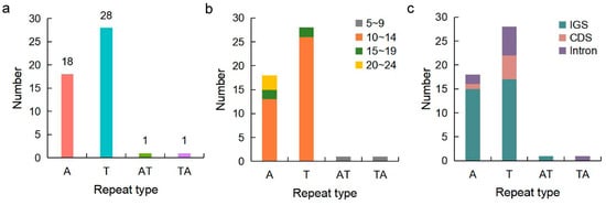 A total of 48 SSRs, including two types (mononucleotide repeats and dinucleotide repeats), were detected in the cp genome of T. costata (Table S2). These repeats are composed of a/t bases (A/T and AT/AT, as shown in Figure 2a). The majority of SSRs consisted of 10–14 repetitions (39, 81.3%, as shown in Figure 2b). Most SSRs are located in the intergenic spacer (IGS) region (33, 68.8%), followed by the introns of PCGs (rpl16, atpF, and ndhA; see Table S2 and Figure 2c) in the cp genome.