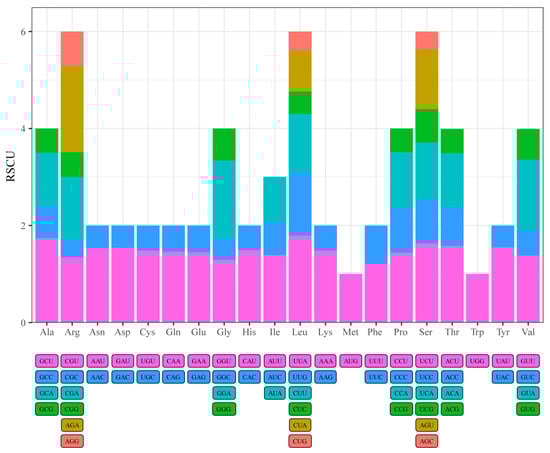 The RSCU values of codons. For each amino acid, the codon with higher RSCU values is highlighted in pink. There are a total of 30 codons with RSCU values greater than 1.