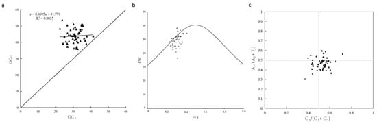 Analysis of codon usage. (a) Neutral plot. (b) ENC plot. (c) PR2 plot. All symbols in the figures are represented by 53 protein-coding genes.
