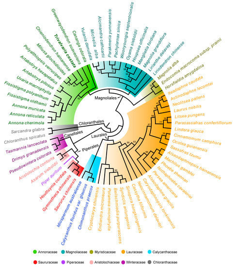 The complete cp genome sequences of 67 other species were downloaded from the NCBI database (https://www.ncbi.nlm.nih.gov/nuccore/?term=, (accessed on 20 December 2022)), including 66 magnoliidae species covering 4 orders, 9 families, and 62 genera, while the remaining 2 belonged to the Chloranthales species and served as the outgroup (Table 1).