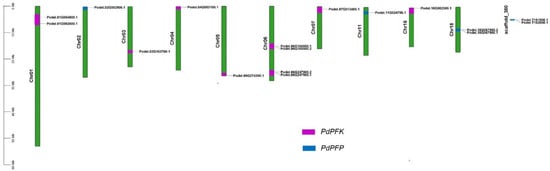 2.3. Chromosomal Location and Collinearity Analyses of PdPFK Genes