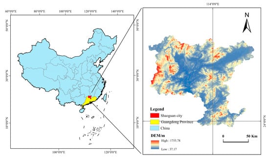 Shaoguan city is located in the northeast part of Guangdong Province, China. The whole territory is located between 23°53′–25°31′ N and 112°53′–114°45′ E (Figure 1). The types of landform in Shaoguan are complex and diverse, including mountains, hills, tablelands and plains. The terrain is generally high in the north and low in the south, with many mountains and high hills in the north. The spatial and temporal distribution of water resources in Shaoguan city is uneven, with frequent floods in summer and autumn, drought in winter and spring. The city’s annual average precipitation is 1700 mm, and annual average temperature is 21 °C.