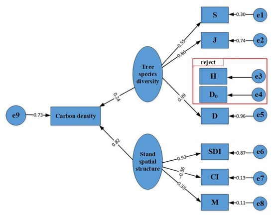The Pearson correlation between eight indices and carbon density was analyzed. According to the Pearson correlation coefficients ranked in descending order, SDI (0.781 **) > S (0.564 **) > M (0.523 **) > H (0.491 **) > D0 (0.466 **) > D (0.446 **) > J (0.256 **) > CI (−0.258 **), with all indices showing significant correlations at the 0.01 level. Due to the serious issue of collinearity between D0 and H, which caused the model to be unstable and poorly fitted, these two factors were removed from the final structural equation modeling (SEM) analysis (Figure 2).