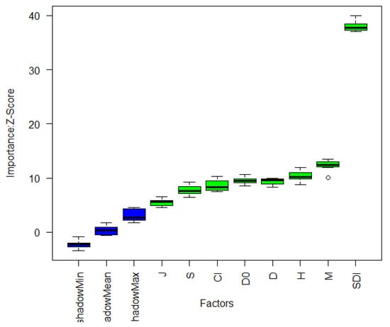 Boruta result plot eight indices. Blue boxplots correspond to minimal, average and maximum Z score of a shadow attribute. Green boxplots represent Z scores of confirmed attributes.