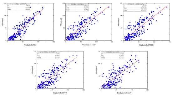 Accuracy evaluation of five estimation models. The blue circle represents the forest carbon density, and the line represents the fitting line between the observed and predicted values.