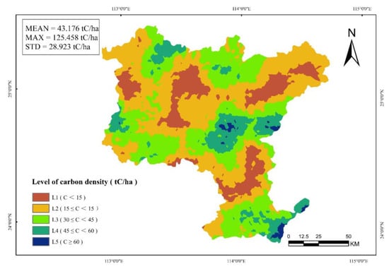 The subtropical forest has a special status in the global ecological environment and plays an important role in the carbon cycle of the global terrestrial ecosystem. China’s subtropical forest is a unique global forest ecosystem at the same latitude, with multiple forest types, various species and high forest productivity []. As an important component of the collective-owned forest region in Southern China, the forest in Shaoguan has the characteristics of high forest coverage and rich biodiversity. Although the forest resources in Shaoguan have been in a steady state of growth, due to frequent human activities, the accelerating process of urbanization and industrialization and related forestry policies, there are still some problems existing in regional forests, such as uneven spatial distribution of forest, low unit stock volume, unreasonable forest types and age class structure. The study of forest carbon density predication and its influencing factors has important practical significance to the making of regional management measures for increasing forest sinks and reducing emissions.