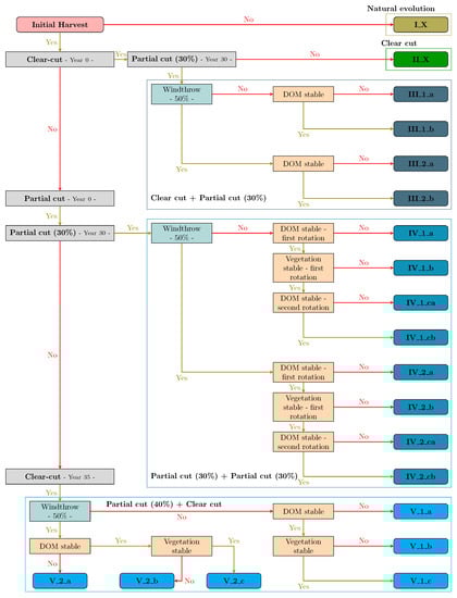 Forest management scenario identification flowchart. For scenario names, the Roman numeral corresponds to the harvest type family, the Arabic numeral corresponds to the windthrow assumption (0% or 50%), and the final letter corresponds to the simulated carbon dynamics. The windthrow and carbon dynamics alternative occurred only during the partial cutting period, if any.
