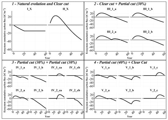 Scenarios with an initial clearcut followed by a partial cut at year 30 (III_X_X scenarios) were predicted to be smaller forest ecosystem cumulative sinks () in comparison to the clearcut scenario (II_X), despite having the same starting point.