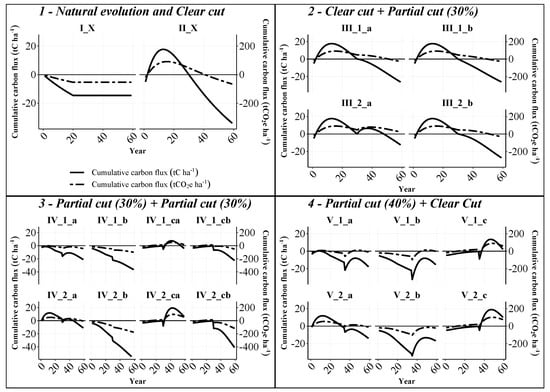 The clearcut scenario (II_X) appeared to be the third largest cumulative carbon sink at the end of the simulated period, with , the first two scenarios being extreme ones with high windthrow percentages and no DOM carbon loss (IV_2_b with and IV_2_cb with ). Thus, by the end of the next clearcut rotation period (60 years), partial harvest types were predicted to be mostly smaller cumulative sinks in comparison to a unique clearcut (Figure 2). However, the absolute maximum cumulative value of the carbon emission period was predicted as a result of an initial clearcut, with values around for years 10, 11, and 12.