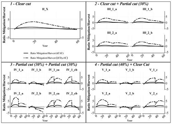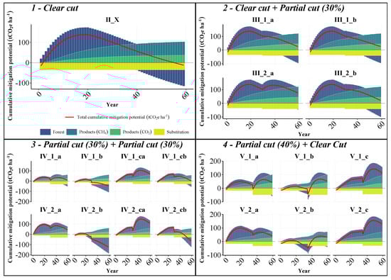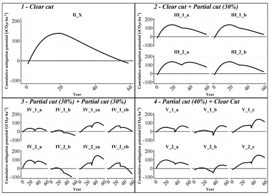 Mitigation potential was computed as the comparison between an alternative and the reference scenario (Natural evolution). Our results predicted that all scenarios except four (IV_2_b, IV_2_cb, IV_1_b and II_X) would become cumulative COe sources compared with the reference, up to for the V_2_c scenario (Figure 4), at the end of the next harvest cycle (60 years). The cumulative carbon budget of the reference scenario (I_X) was predicted to be a sink during all of the simulated period (Figure 3); therefore, in the mitigation potential calculation, any carbon emission following a harvest event in an alternative scenario (Figure 3) caused this alternative to be a comparative source (Figure 4). After an initial 20-year period of emissions for all alternative scenarios, they followed different trends. There was either an increase (IV_1_ca, IV_2_ca, V_1_b, V_2_b, V_1_c, V_2_c), a stabilization (IV_1_a, IV_2_a, V_1_a), or a decrease (II_X, III_X_X, IV_1_b, IV_2_b, IV_1_cb, IV_2_cb, V_2_a) of the cumulative COe source relative to the reference (Figure 4). Most scenarios remained a cumulative COe source over the whole simulated period. Three of the four scenarios were predicted as cumulative COe sinks, i.e., IV_2_b with , IV_2_cb with , and IV_1_b with were partial cut scenarios for which the DOM pool was assumed to remain stable (Figure 4). The clearcut scenario (II_X) was expected to procure the lowest cumulative mitigation potential of the four, with (Figure 4).
