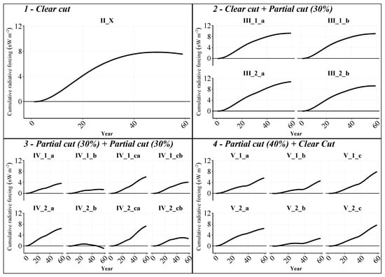 Cumulative radiative forcing relative to the reference. All results shown are relative to the reference scenario (Natural Evolution) for the whole forest sector (emissions and removals from forest ecosystems, decay of wood products, and substitution effects of wood products on markets). Positive values represent a warming effect, and negative values represent a cooling effect for a particular scenario relative to the reference. For scenario names, the Roman numeral corresponds to the harvest type, the Arabic numeral to the windthrow assumption, and the last letter to the carbon dynamics assumption following partial cut (if any). Default (a) carbon dynamics defined by Senez-Gagnon et al. [9] for clearcut, DOM stable (b) modified the Default by stabilizing DOM pools after the cut (no positive or negative DOM stock variation), and the DOM stable + Vegetation stable (c) assumption modified the Default (a) by stabilizing all ecosystem carbon pools (ecosystem carbon sequestration equal to emissions).