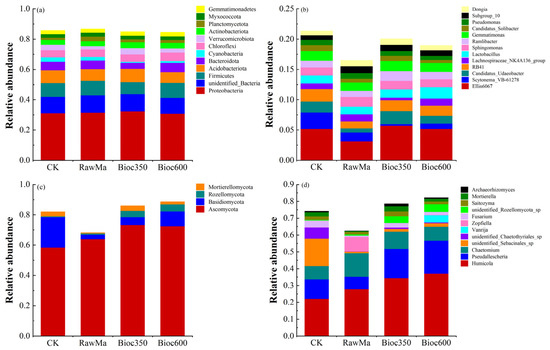 APA StyleJin, Y., Tian, Y., Yang, R., Li, W., Liu, C., & Li, T. (2023). Poplar Sawdust Biochar Altered Community Composition of Dominant Soil Fungi but Not Bacteria Depending on Pyrolysis Temperature. Forests, 14(6), 1114. https://doi.org/10.3390/f14061114