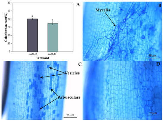AMF root colonization rate (A), light micrographs of AMF-inoculated root (B,C), and AMF non-inoculated root (D) of C. oleifera seedlings. +AM+B: AMF inoculation and normal B; +AM−B: AMF inoculation and B deficiency. Values (A) are expressed as means ± SE. Significant differences between means were determined using significant difference T-test. Different lowercase letters indicate significant differences between treatments, p < 0.05.