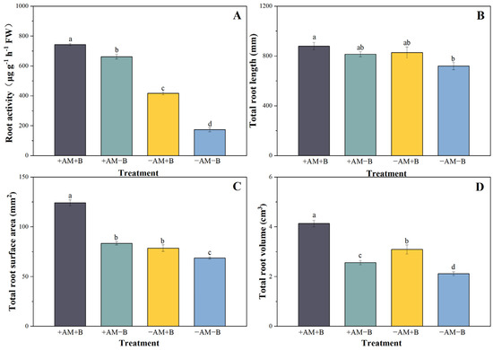 Effects of boron deficiency and AMF inoculation on root activity and root morphology of C. oleifera seedlings (n = 3). Root activity (A), total root length (B), total root surface area (C) and total root volume (D) of C. oleifera seedlings. +AM+B: AMF inoculation and normal B; +AM−B: AMF inoculation and B deficiency; −AM+B: no AMF inoculation and normal B; −AM−B: no AMF inoculation and B deficiency. Values are expressed as means ± SE. Significant differences between means were determined using Tukey’s honestly significant difference test. Different lowercase letters indicate significant differences between treatments (p < 0.05).