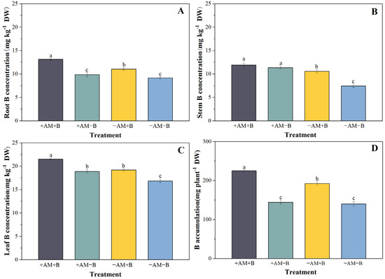 AMF inoculation improved the B content in stems and leaves in both B-deficiency- and normal-B-supply-treated C. oleifera seedlings (p < 0.05) (Figure 3B,C). Under normal B treatment conditions, the B content in the roots, stems, and leaves of uninoculated seedlings decreased by 18.7%, 12.5%, and 12.1%, respectively, compared with AMF-inoculated treatments (Figure 3A–C). B accumulation in normal-B-treated plants was higher than that in B-deficiency-treated C. oleifera seedlings (p < 0.05). AMF inoculation significantly increased the plant’s B accumulation in normal-B treatments (Figure 3D).