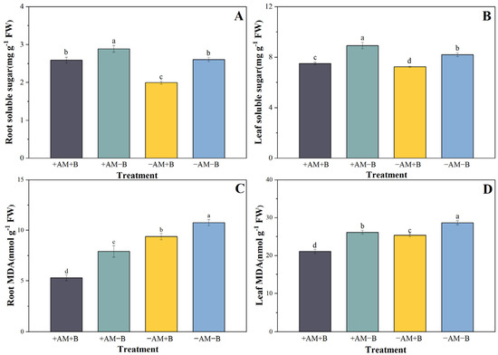 AMF inoculation significantly increased soluble sugar contents in roots and leaves under different boron treatments (p < 0.05) of C. oleifera seedlings (Figure 4A,B). The MDA contents in roots and leaves significantly differed among the four treatments, and the MDA contents in leaves were significantly higher than that in the roots of C. oleifera seedlings (p < 0.05). B deficiency increased the MDA content, while AMF inoculation significantly decreased MDA contents in both the leaves and roots of C. oleifera seedlings (Figure 4C,D).