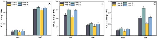 The SOD activities in roots and leaves significantly differed among the four treatments of C. oleifera seedlings (p < 0.05). The +AM−B-treated plants had the highest SOD activity in roots and leaves (Figure 5A). The B-deficiency treatment significantly improved the SOD, POD, and CAT activities in the roots and leaves in both AMF-inoculated and non-inoculated C. oleifera seedlings. AMF inoculation enhanced SOD, POD, and CAT activities in roots and leaves in B-deficiency-treated C. oleifera seedlings (p < 0.05).