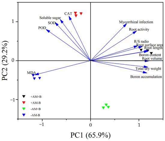A principal component analysis of 14 indicators was performed for dimension reduction. There are two components with eigenvalues greater than 1, and PCA scores for the four treatments are shown in Figure 6. The first principal component eigenvalue is 8.610, and the larger contributing indexes are total root length and soluble sugar; the second principal component eigenvalue is 5.614, and the larger contributors are SOD and CAT. The main variables with high loads on axis 1 are the R/S ratio, root length, root surface area, root volume, root vitality, and malondialdehyde. The main variables with high loads on axis 2 are mainly soluble sugar, soluble protein, SOD, POD, CAT, and boron accumulation. There is a positive correlation between root activity and the mycorrhizal infection rate and R/S ratio. The four treatments are distributed in different quadrants, indicating significant differences between treatments.