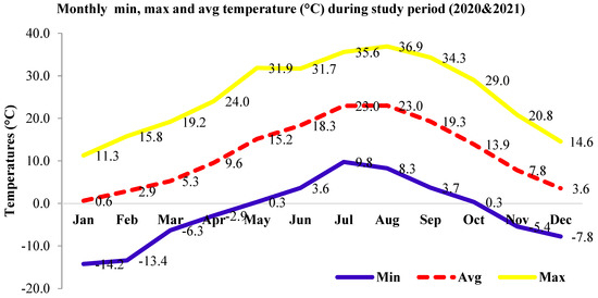 Monthly maximum, minimum, and average temperatures of the studied location during the study period.
