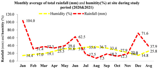 Monthly average of total rainfall and the humidity of the studied location during the study period.