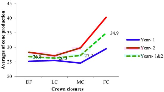 The average cone numbers of DF, LC, and MC (Table 2 and Figure 4) were slightly higher than two populations of the species reported earlier (20 and 22) [9] and a population (19) [11] of Taurus cedar, while it was dramatically higher in FC (40.3) in year 2. It could be due to more competition among trees in FC than the other crown closure classes. Rotation periods of Taurus cedar were 120–140 years on good sites and 160–180 years on poor sites [1]. The crown closure in populations that were at the end of rotation age seemed stable for cone productions in the present study. It is generally suggested that taller trees allocate much of their energy to vegetative growth rather than to reproductive growth [21]. Initial research results and observation suggested that 15–20 kg/ha of additional seeds was sufficient for shelter-wood areas, but higher rates of 20–30 kg/ha were necessary for the strip clear-cut areas of the species [1]. The results of the study showed that additional cones/seeds could be obtained by CCC management, such as balancing of the tree density and crown closure using forestry practices.