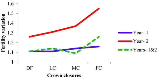 The fertility variation (sibling coefficient, Ψ) ranged from DF and LC to FC in year 1 and increased with the crown closure from DF to FC in year 2. The fertility variations of CCCs in year 2 were decreased by combining the years, while the combined fertility variation (1.09) was lower than each year of MC (Table 5 and Figure 5). It was 1.14 (88% fertile trees), 1.45 (69%), and 1.19 (84%) for years 1 and 2 and across CCCs, respectively.