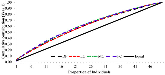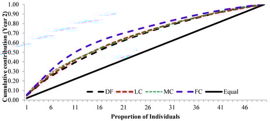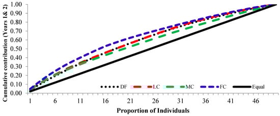 The cumulative contribution curve describes the relative proportion of trees to the accumulative gamete contribution. In an ideal situation, an equal contribution from each of the individuals (a condition where Ψ = 1) is expected; this cumulative curve attained a straight line. There was a deviation in cumulative contribution from the expectation in all crown closure classes. It could be inferred that various crown closure classes (DF, LC, MC and FC) showed a similar trend in both years (Figure 6 and Figure 7). Only FC showed a skewed distribution in year 2. It could thus be concluded that the FC deviated from the ideal situation more, compared to the other three crown closures, only in year 2 (Figure 7), and fertility combined for two years (Figure 8). When the seed crops of the two years were mixed, the cumulative contribution increased (Figure 8) in all crown closure classes.