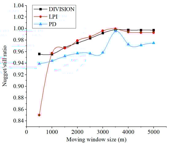 The nugget/sill ratio changes of landscape metrics with different moving window sizes.
