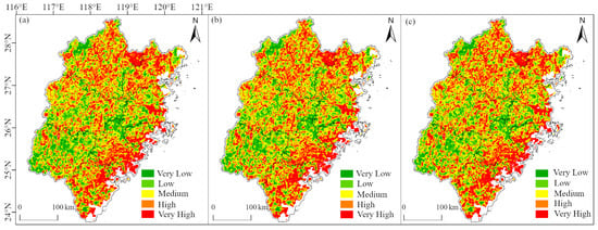 To facilitate the analysis of spatiotemporal variations of forest fragmentation, the FFCI obtained by principal component analysis was classified into five categories (Figure 3): very low (0 ≤ FFCI < 0.2), low (0.2 ≤ FFCI < 0.4), medium (0.4 ≤ FFCI < 0.6), high (0.6 ≤ FFCI < 0.8), and very high (0.8 ≤ FFCI < 1.0). The results showed that the areas with lower fragmentation were mainly distributed in Longyan, the west of Nanping, and Ningde, the areas with medium to high fragmentation were mainly distributed in Sanming, Putian, and Zhangzhou, and the areas with higher fragmentation gathered in the central urban area of coastal cities. Table 4 listed the proportion of each type of FFCI in 2000, 2010, and 2020. The results show that high-fragmentation areas had the highest proportion in all three periods (27.7%, 28.1%, and 27.7%), followed by medium-fragmentation areas. The sum of the proportions of these two fragmentation types exceeded 50% in all 3 years. The proportion of low fragmentation was the lowest, which indicated that the degree of forest fragmentation in the study area was at an upper–middle level. From 2000 to 2020, the very-low- and low-fragmentation areas showed a gradual decrease. The proportion of medium-fragmentation areas decreased from 27.4% in 2000 to 27.1% in 2020; however, the value was moderately increased to 27.6% in 2010. The proportion of high-fragmentation areas also showed a slight increase from 27.7% in 2000 to 28.1% in 2010, but then decreased to 27.7% in 2020. The areas with very high fragmentation showed a constant increasing trend throughout the study periods, with a higher increase in the 2010–2020 period than in the previous period. Thus, the degree of forest fragmentation in study area increased over time.
