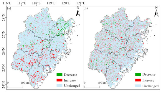 In terms of the temporal change of forest fragmentation, from 2000 to 2010, there was a decrease in forest fragmentation in 2.7% of areas, whereas the areas with increased forest fragmentation accounted for 4.8%. Quanzhou, Zhangzhou, and Longyan were the primary areas where forest fragmentation increased, while Ningde had the largest decrease. From 2010 to 2020, the areas with increased fragmentation accounted for 6.7%, a slight increase from the previous stage. The proportion of the areas with reduced forest fragmentation was 2.8%, a slight decrease compared with the previous stage.