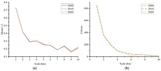Global autocorrelation parameters of FFCI at different spatial scales: (a) Moran’s I value; (b) z-Score.