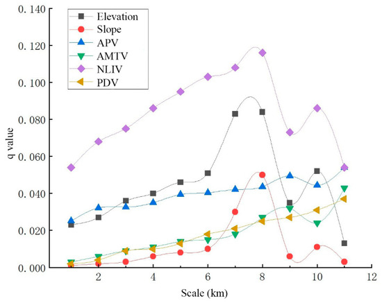 The factor detector was used to determine the explanatory power of various driving factors with regard to the variation in FFCI. We analyzed the q value of driving factors at 11 grid scales (Figure 7), and the q value showed a general increasing trend at a scale of 1000 m to 8000 m for each driving factor, indicating that the explanatory power of driving factors with regard to the variation in forest fragmentation gradually increased in the range of this scale. However, at the scale of 9000 m, the q values of elevation, slope, and NLIV showed a significant decrease, indicating that the explanatory power was weakened. There was no obvious change in q value of AMTV and APV at scales from 8000 m to 11,000 m. Therefore, the scale of 8000 m was selected as the optimal scale to analyze the impact of driving factors on the variation in FFCI.