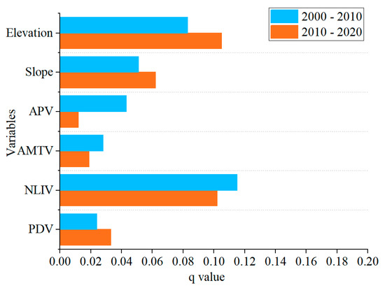 Figure 8 shows the q value of driving factors at the scale of 8000 m (p < 0.01). During periods from 2000 to 2010, the explanatory power of NLIV and elevation was largest among all driving factors, with the q value being 0.116 and 0.084, respectively, while the explanatory power of PDV was lowest, with the q value being 0.025. Results showed that the geomorphic factors and nighttime light intensity were the dominant single factors influencing the variation in forest fragmentation. During the periods from 2000 to 2010, the explanatory power of each driving factor from high to low was elevation > NLIV > slope > PDV > AMTV > APV. Compared to last period, the explanatory power of APV and AMTV decreased, indicating that the impact of meteorological factors on the variation in forest fragmentation was small in Fujian Province.