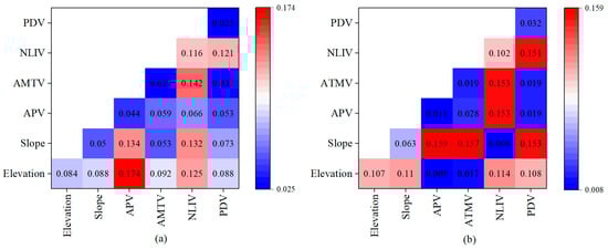 With the aid of the interactive detector in GD, we analyzed the superimposed impact of interactions between different driving factors on the variation in FFCI (Figure 9). In the period from 2000 to 2010, the explanatory power with regard to the variation in FFCI by any two driving factors was greater than that of any single driving factors, indicating that the impact of driving factors on spatial heterogeneity of the variation in FFCI was not independent. Specifically, the interaction between APV and slope was the strongest among all interactions (q = 0.174). It can be clearly seen that, while the individual impact of meteorological factors on the variation in FFCI was small, the superimposed impact of the interaction between them and geomorphic factors increased significantly with regard to the variation in forest fragmentation. However, in the period from 2010 to 2020, the interactions between APV and elevation (q = 0.009), and between ATMV and DEM (q = 0.117) were nonlinear weakening, and the explanatory power was weakened; the interactions between slope and APV, and between slope and AMTV were strongest, with q values above 0.157. This indicates that the interaction between slope and meteorological factors jointly contributed to the spatial differentiation of the variation in FFCI from 2010 to 2020.