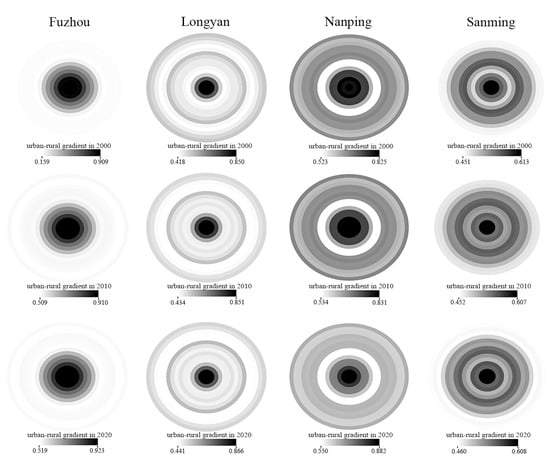 Mean FFCI along the urban–rural gradients for representative cities. The center of the circle is the location of the city government, while the radius represents the distance from the urban center (2000 m, 4000 m, 6000 m, …, 30,000 m).