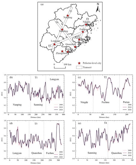 The location of transects with 15,000 m width along with the corresponding FFCI changes: (a) location of transects; (b) FFCI changes of transect T1; (c) FFCI changes of transect T2; (d) FFCI changes of transect T3; (e) FFCI changes of transect T4.