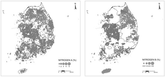 The national forest soil map, which provides information on the total nitrogen content in the A and B horizons, includes data from field surveys and experiments conducted from 2009 to 2021. The soil sample analysis data used in this study were composed of 5457 samples from the A horizon and 6072 samples from the B horizon (Figure 2).