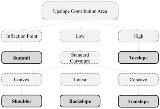 Flow chart of the hillslope position classification system using the Upslope Contributing Area Priority Decision Tree methodAdapted with permission from [25].;published by Journal of the Korean Geographical Society.