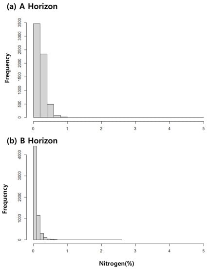 Figure 2 illustrates the spatial distribution of total nitrogen contents in the forest soil for both the A and B horizons. The soil data in both horizons were somewhat spatially biased, but the A horizon data were relatively more uniform as it integrated NFI data collected from standard, evenly distributed points. It was observed that the areas with higher elevations and those located in the northeastern regions of South Korea tended to have higher soil nitrogen contents in both horizons.