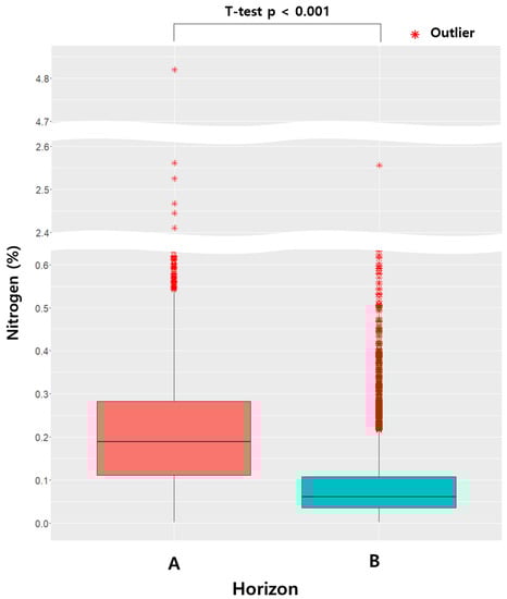 The majority of the soil nitrogen data in the A and B horizons exhibited values within a range of 0%–1% (Figure 4), with only a few instances where they extended up to 4.8% (A horizon) or 2.6% (B horizon). The mean total nitrogen content of the A horizon was 0.22%, while that of the B horizon was 0.09%. The standard deviation was either similar to the mean for the A horizon or greater than the mean for the B horizon. Consequently, the coefficient of variation of the A horizon was 80.21%, while that of the B horizon was 125.88%. This indicated that the total nitrogen content values in mountainous soils on the Korean Peninsula exhibit high variance. Moreover, the results of the t-test indicate that there was a statistically significant difference in the distribution and variability of soil nitrogen between the A horizon and the B horizon (Figure 5).