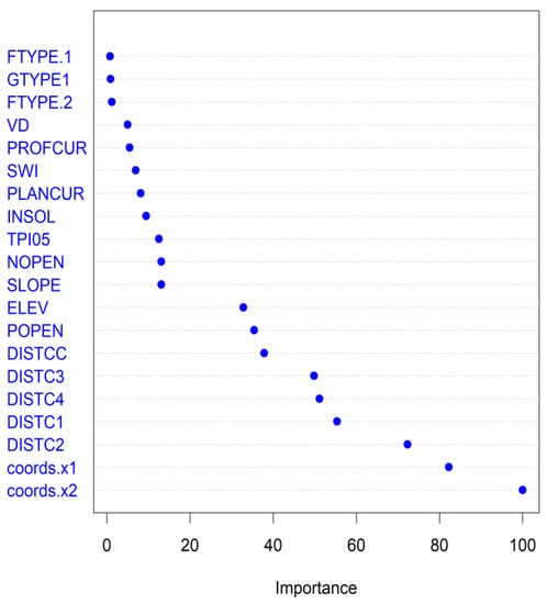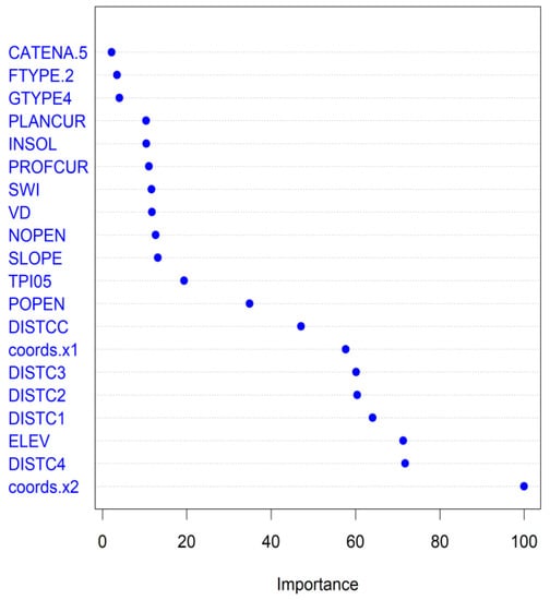 As the RF method demonstrated superior performance in predicting the soil nitrogen contents of both horizons, a variable importance analysis was conducted for each horizon to identify the key variables used in the RF algorithm (Figure 6 and Figure 7). For the A horizon, the most important predictors were found to be geographic variables, such as coords.x2, DISTC4, and DISTC1. Elevation (ELEV) showed relatively high variable importance, followed by terrain openness (POPEN) and curvature (TPI05). Furthermore, the nitrogen content in the A horizon was affected by factors such as andesite as the parent material (GTYPE4), the broad-leaved forest type (FTYPE2), and the toeslope topographical position (CATENA5).