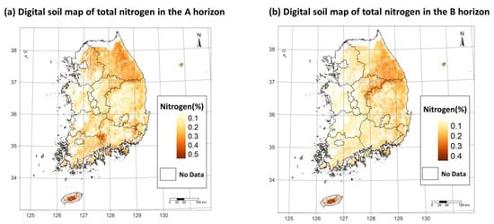 Digital soil map of total nitrogen in the A and B horizons (a,b).