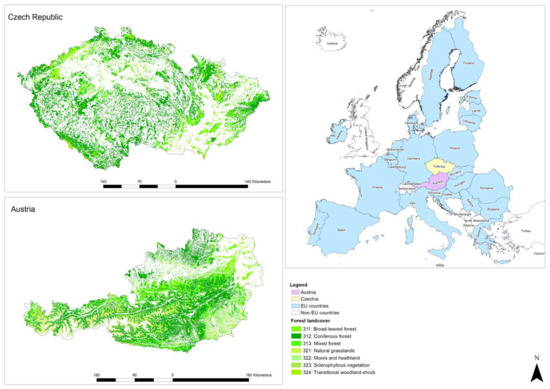 The study area includes two European Union state members: Austria and the Czech Republic (Czechia), see Figure 1. These two countries were selected as case studies to identify and contrast the EIs implemented and the financial programs of the forest-based sector as they have comparable areas, share of forest area, and gross value added concerning the forestry industry in 2019 (83,878 km2; 46.4%; EUR 869.52 million in Austria and 78,871 km2; 37.9%; EUR 933.39 million in Czechia) [57].