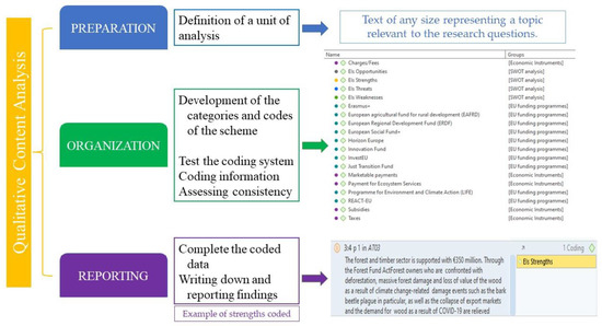 The analysis process was based on three phases: preparation, organization, and reporting [61]. A series of activities were developed within each phase to make the process more rigorous (see Figure 3). The basic unit of text analysis was defined during the preparation phase. In this case, the analysis unit is a text of any size representing a topic relevant to the research questions. In the organization phase, the categories and the coding scheme were defined according to the literary review, prior knowledge, and data collected. Additionally, each code was provided with a definition to avoid misinterpretation during the coding process. The main category includes general concepts such as economic instruments, SWOT analysis, or financing programs. At the same time, the subcategories refer to specific concepts such as subsidies, taxes, and charges within the economic instrument category. The coding system was then tested on a small sample (two policy documents), and the necessary modifications to the coding system were made. Once the scheme was improved, all the core documents selected were coded (in this case, 18 strategic documents for the operation of the forest-based sector in the EU, Austria, and Czechia—see Table 1). Then, the consistency of the coding was validated since new categories were included during the coding due to their relevance with respect to answering the research question. In the last phase (the reporting phase), the data coding was completed, and code diagrams were prepared (as well as different graphs) to present the results and enable us to move on to the next stage of our results analysis.