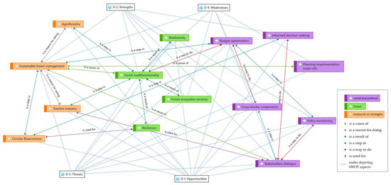After identifying the strengths, weaknesses, opportunities, and threats, key concepts were extracted to form a comprehensive conceptual network. This network was developed by leveraging universal semantic relationships, facilitating an analysis of the interconnections among the identified terms [84]. The primary objective of this approach was to enhance our comprehension of the differentiations and shared characteristics among the key terms, thereby elucidating their implications for improving economic instruments and their role in financing the forest-based sector.