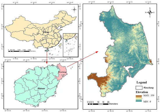 The study area was located in Wenchang City, Hainan Province, China (19°36′~20°3′ N, 109°12′~111°2′ E), with an average altitude of 42.55 m, belonging to the coastal plain on the northern edge of the tropics (Figure 2). There is no obvious seasonal variation in this area, the annual average temperature is 23.90 °C, the rainfall mainly occurs from May to October, the annual precipitation is 1721.60 mm, and the annual average humidity is 87%. The main soil is coastal sandy soil. The pH value of the soil is between 5.0 and 6.6, which is very suitable for the growth of tropical crops.