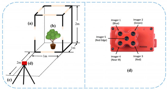 Schematic diagram of the image acquisition device: (a) darkroom; (b) A. sinensis; (c) tripod; (d) Mica Sense Edge 3™.