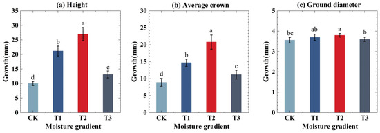A shown in Figure 4a,b, there were significant differences in tree height and canopy growth under different water treatments (p < 0.05). The tree height and crown width of the T1 group increased by 17.0 and 11.2 mm, respectively, and the tree height and crown width of the T2 group increased by 11.9 and 5.8 mm, respectively, which were significantly higher than those of the CK group. However, the tree height and crown width of the T3 group increased by only 3.1 and 2.3 mm, respectively, which were significantly less than the T1, and T2 groups. This showed that both drought and waterlogging conditions could inhibit the growth of A. sinensis, but the inhibitory effect of the drought condition was more obvious. As shown in Figure 4c, the difference in ground diameter growth under different water treatments was not significant (p < 0.05). This showed that the effect of water treatment on ground diameter was relatively small compared with tree height and crown width. Compared with the other treatment groups, the tree height, crown width, and ground diameter growth of the T3 group were the largest, and the differences with the CK group were the most significant, indicating that a soil water content of 60%–80% was most suitable for the growth of A. sinensis.