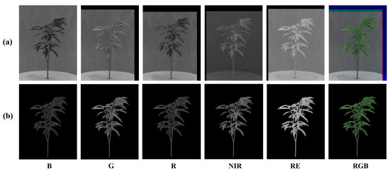 Separating the research area from the background is the basis of applying image information to retrieve the plant water content, but some bands of multispectral images are difficult to separate. The multicamera multispectral imager divides the light from the target into several beams and records the information of each band separately. Although the image quality is improved compared with the beam-splitting multispectrometer, it also makes the images of different bands shift, which makes segmentation work difficult [45].